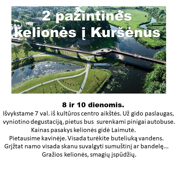 8 d ir 10 d. 7 val. dvi vienodos kelionės į Kuršėnus. Aplankysime medinės architektūsros (gražiausi mediniai ažūrai) dvarą. Vyniotinio degustacija, čia pietausime.Užstatas 10 Eur.