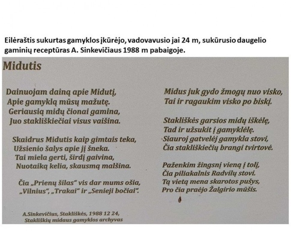 Deja, po didelio viską suniokojusio gaisro nebeatsigavo, nes išpopuliarėjo netoliese buvęs Birštonas. Šiuo metu Stakliškes žinomos dėl čia veikiančios UAB "Lietuviškas midus" ne tik Lietuvoje bet ir pasaulyje. Restauruotame 19 amžiaus salyklo džiovyklos bokšte įkurtas muziejus, kuriame sužinojome midaus atsiradimo istoriją, jo gamybą, sužinojome midaus vartojimo ypatumus. Eilėraštis sukurtas gamyklos įkūrėjo, vadovavusio jau 24 m, sukūrusio daugelio gaminių receptūras A. Sinkevičiaus 1988 m pabaigoje.