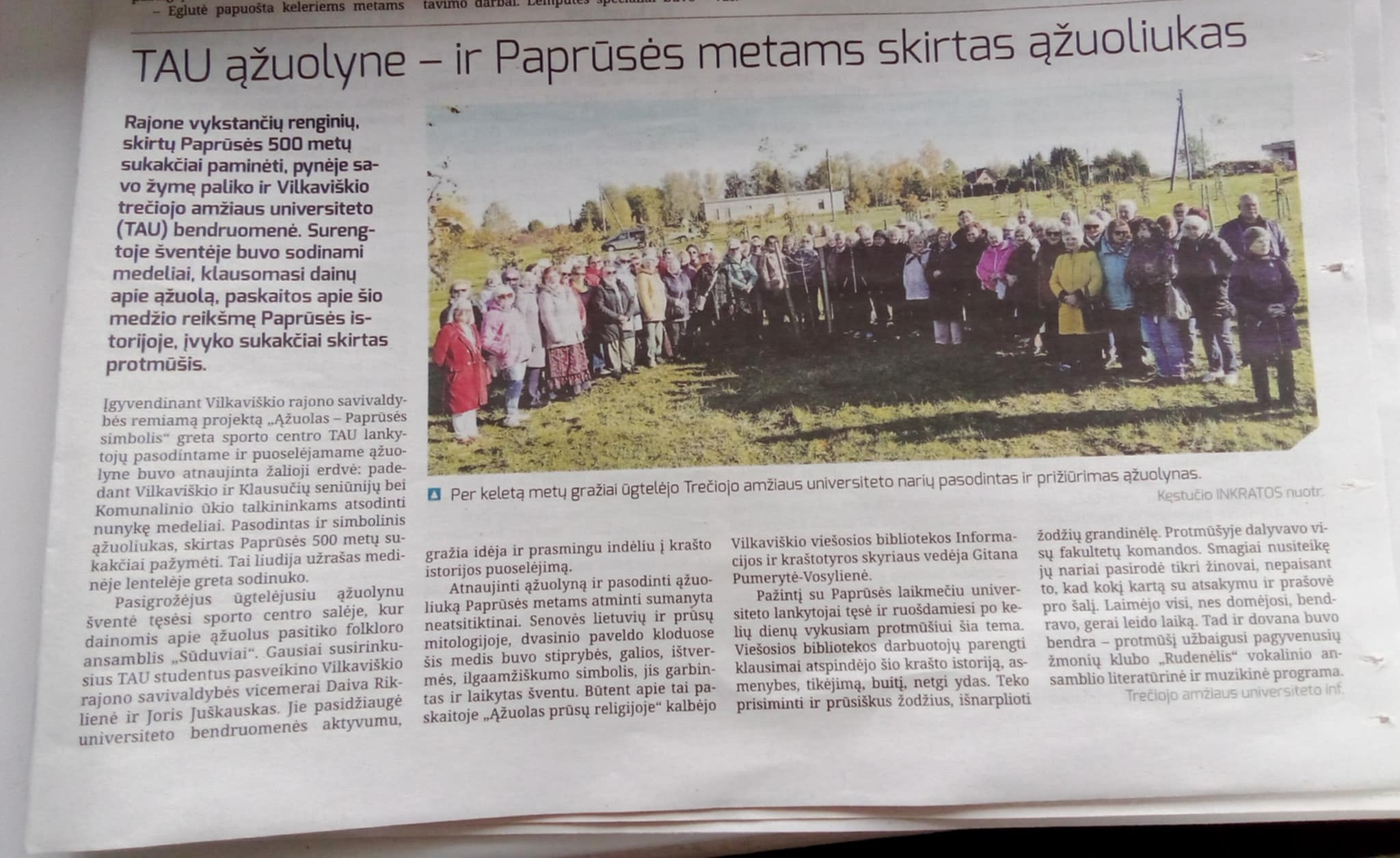 ,,Vilkaviškis Trečiojo amžiaus universiteto studentai šalia neseniai duris atvėrusio sporto ir pramogų centro pasodino 170 ąžuoliukų. Būsimasis ąžuolynas – senjorų projekto „Pasauliui mes vis dar reikalingi“ dalis. O iš viso mieste ketinama pasodinti beveik pusę tūkstančio medžių."