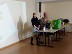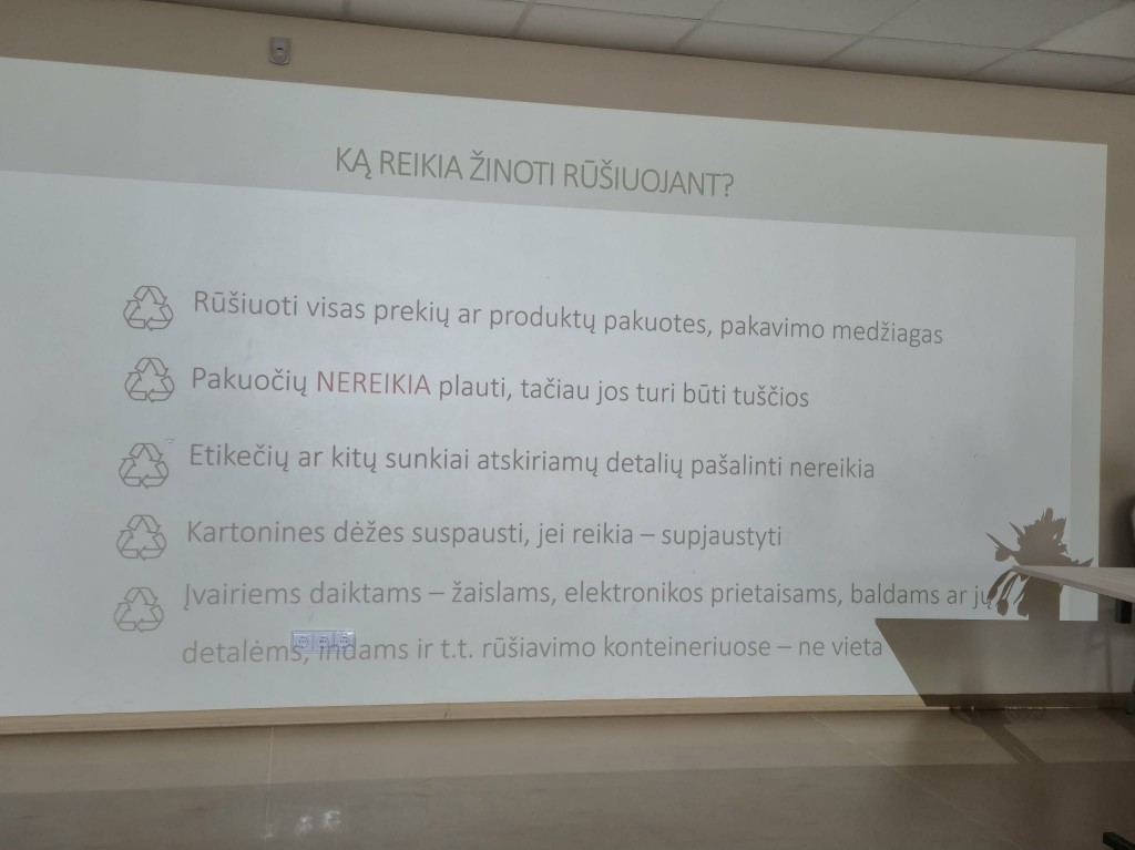 Pakuočių atliekų tvarkymo organizacijos ,, Žaliasistaškas“projektų koordinatorės Jūratė Grambaitė ir Jolita Baltrukevičiūtė vedė puikią paskaitą - edukaciją. Mokėmės, atsakinėjome, klausinėjome, kur mesti dantų šepetuką, kur kvepalų buteliuką, kur dėti sudužusią stiklinę ar vazą.