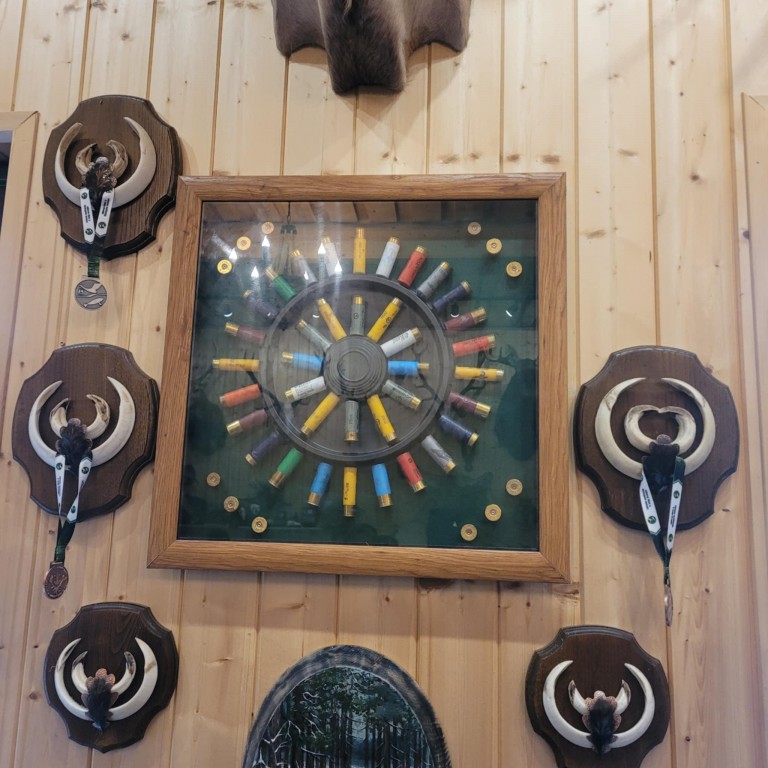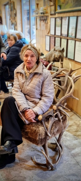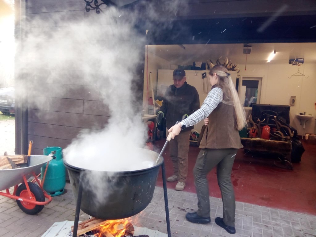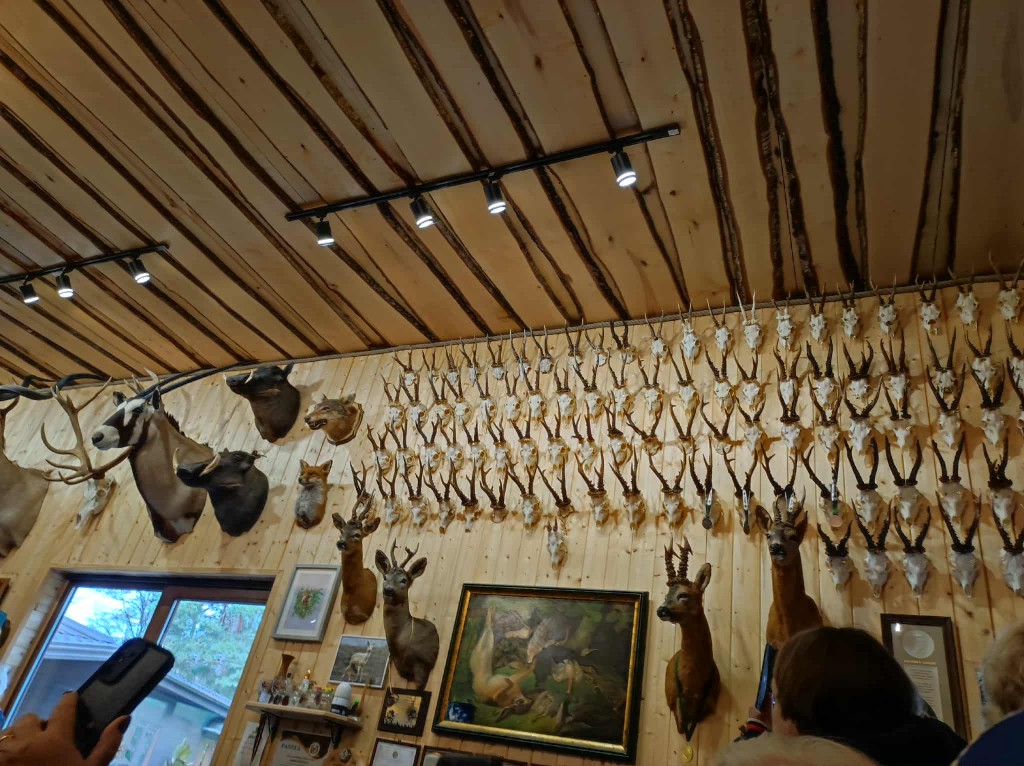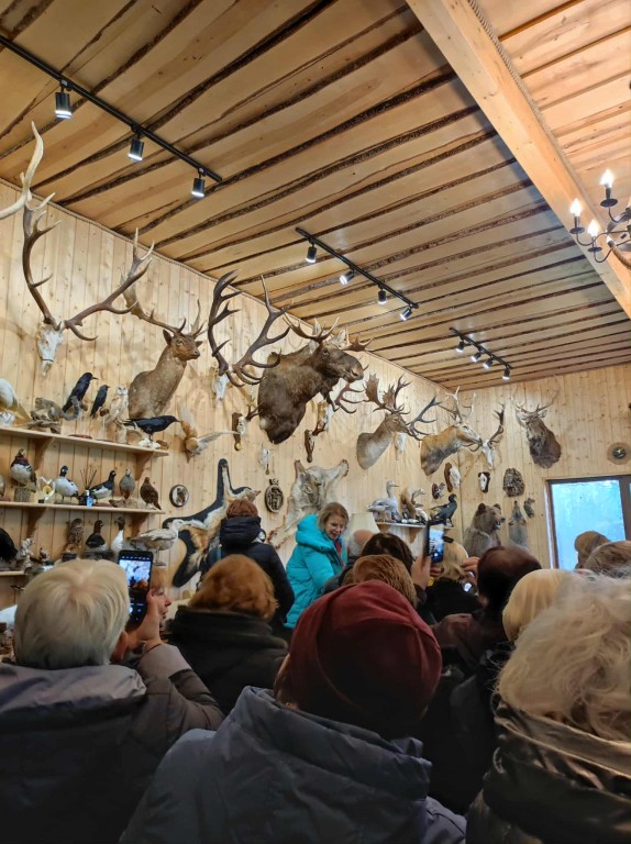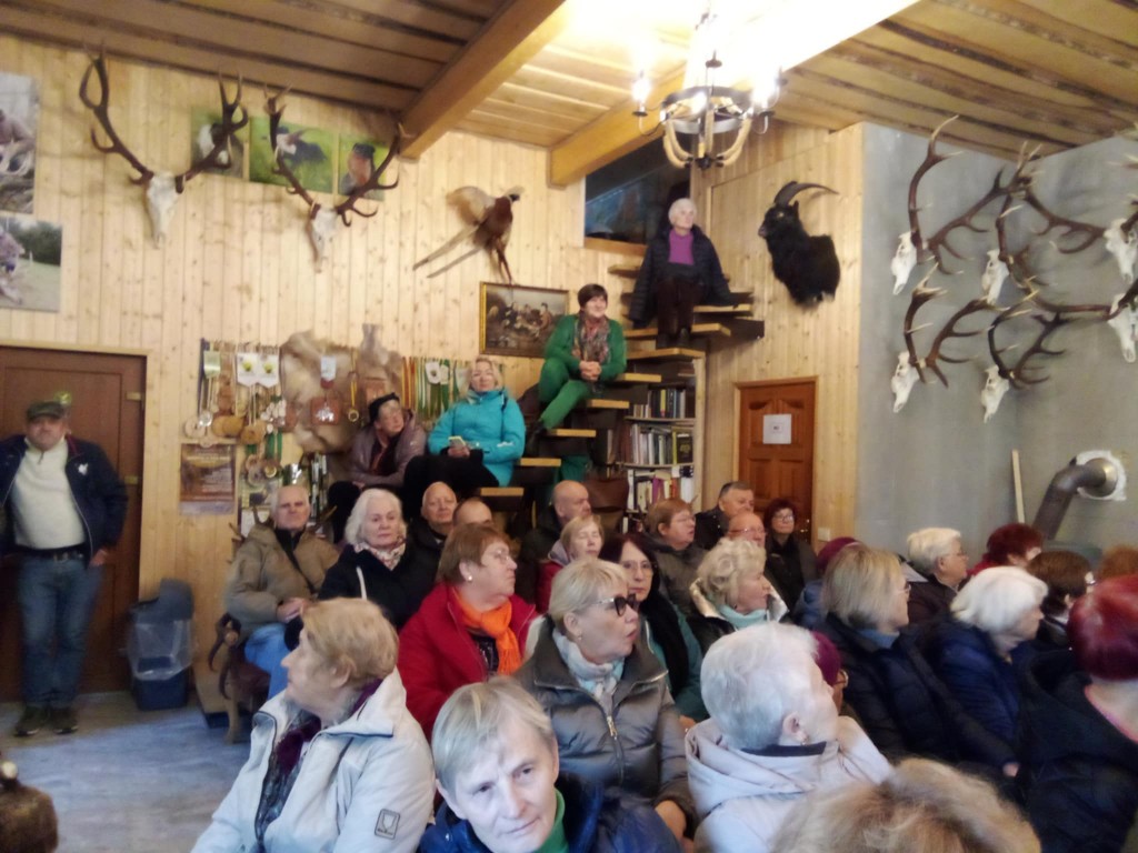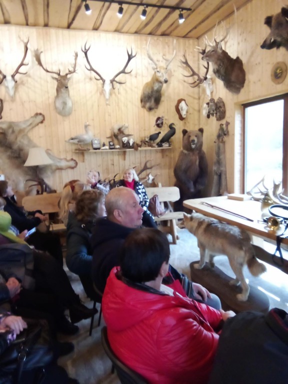 Stirniškių (Gurbšilio miško) medžiotojų namelio šeimininkas Andrius Rapalas su visa svetinga savo komanda Gamtos fakulteto studentus pasitiko besikūrenančio laužo liepsna su sodriais dūmais ir jau kunkuliuojančia, kvepiančia medžiotojų 'šiurpa" . Sugužėję į vidų tik dairėmės ir fotografavome, akys raibo nuo eksponatų gausos, įvairovės ir įdomybių...